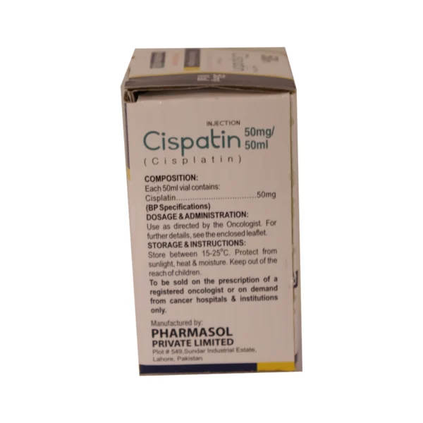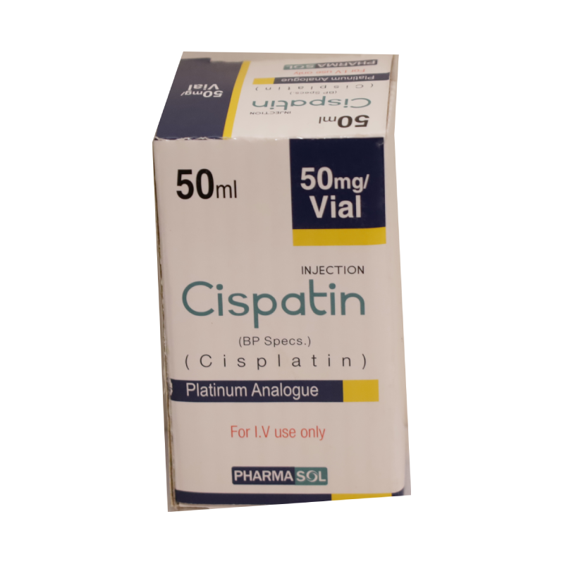 Cisplatin 50 mg Injection contains cisplatin, a platinum-derived chemotherapy agent used in the treatment of numerous cancers including testicular, ovarian, bladder, lung, and head & neck cancers. It works by binding to DNA in cancer cells and disrupting their ability to divide and grow, leading to cell death. Given by intravenous infusion under strict clinical supervision, cisplatin is often used in combination with other anticancer drugs in multi-drug chemotherapy protocols. Due to its potent effects and potential side effects — such as kidney toxicity, nausea, low blood counts, and hearing changes — close medical monitoring and supportive care (hydration, blood tests) are essential.