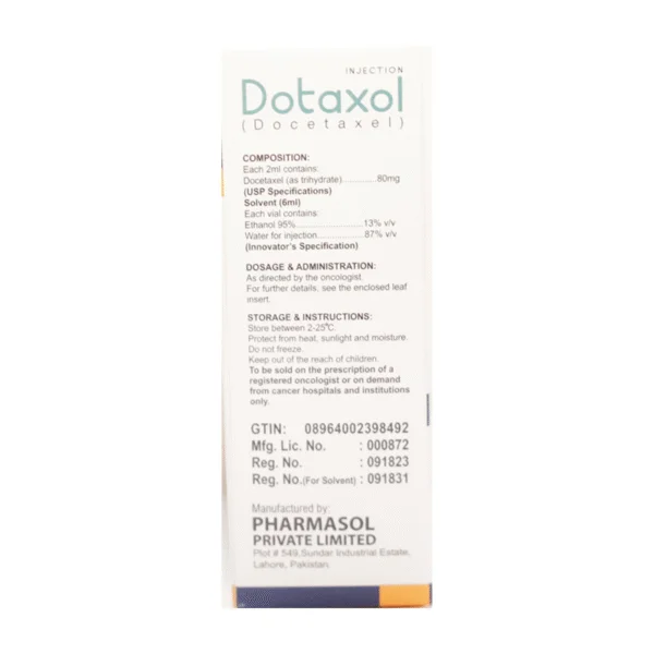 DOTAXOL 80 mg Injection (Docetaxel) – Effective chemotherapy for solid tumors DOTAXOL 80 mg injection is a docetaxel-based anti-cancer medicine used in the treatment of advanced or metastatic cancers, including breast cancer, non-small cell lung cancer (NSCLC), prostate cancer, and other solid tumors. Docetaxel works by inhibiting microtubule function, preventing cancer cell division, and helping slow tumor growth. Prescribed and administered by an oncologist, this chemotherapy injection is typically given via intravenous infusion in a healthcare setting. In Pakistan, DOTAXOL 80 mg vials are available through licensed pharmacies and oncology clinics, with prices generally ranging around ₨ 18,000–₨ 22,000 per vial depending on brand and supplier. Patients should undergo routine blood tests and liver function monitoring before and during treatment, and report any side effects such as nausea, hair loss, or signs of infection promptly to their healthcare provider.